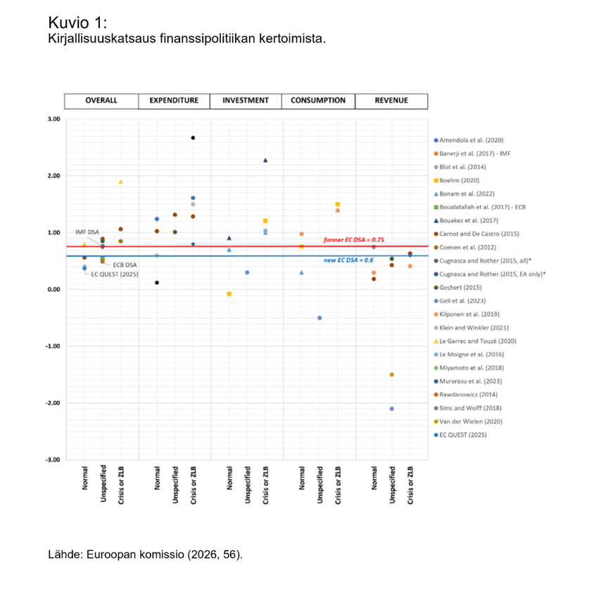 Myös Euroopan komission velkakestävyysraportissa havaitaan meno- ja verokertoimien erot (ks. laatikko 2.5). Kuvio 1 esittää Euroopan komission tekemää kirjallisuuskatsausta, jonka mukaan menokertoimet (expenditure) ovat selvästi suurempia kuin verokertoimet (revenue).