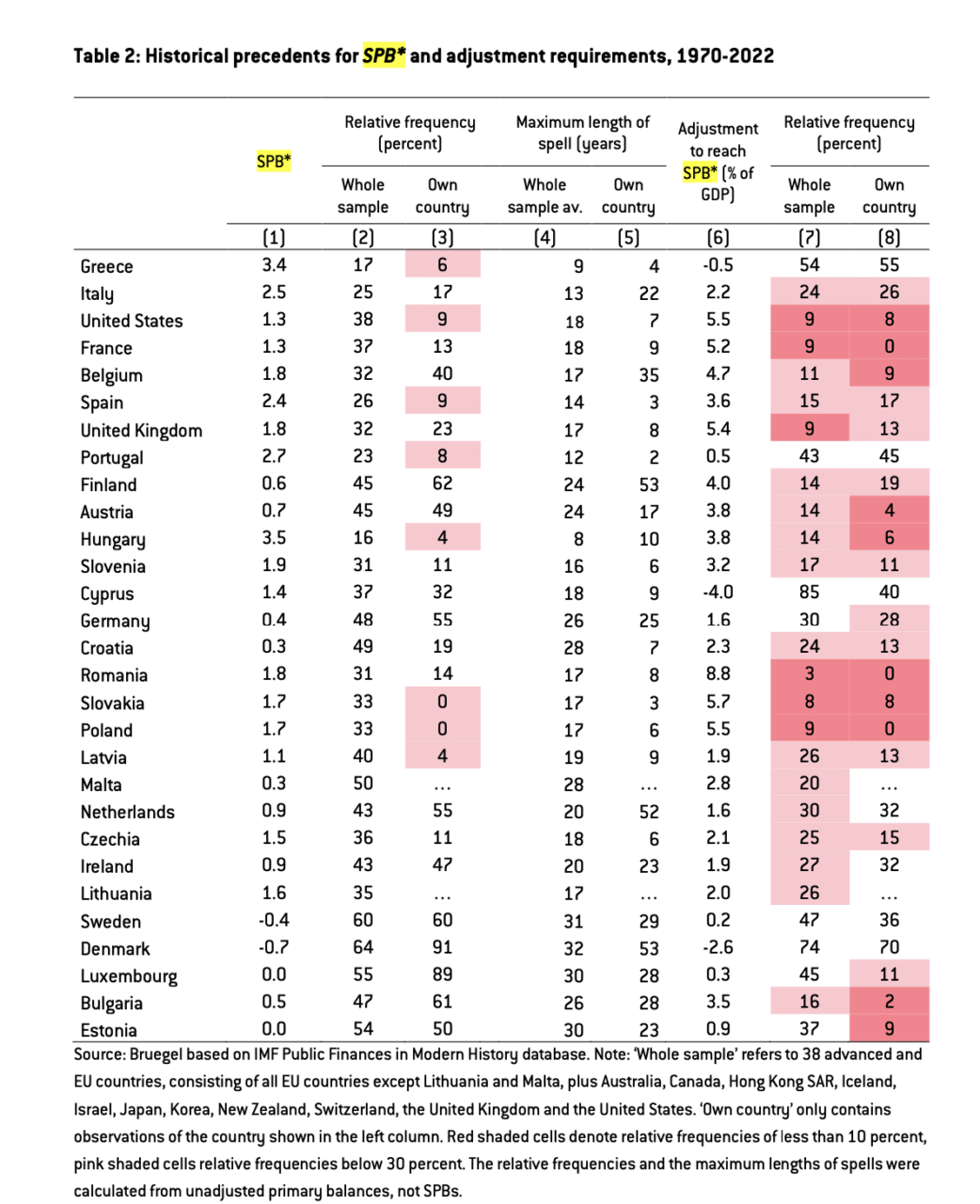 Ajatushautomo Bruegelin raportissa loppuvuonna 2025 tarkasteltiin, kuinka usein historiassaan eri maat ovat kyenneet saavuttamaan niille asetettavia sopeutusvaatimuksia. Bruegelin analyysi ei suoraan perustunut komission käyttämän mallin mukaisiin sopeutusvaatimuksiin, mutta on hyvin lähellä sitä. Kuviosta (sarake 8) nähdään, että esimerkiksi Ranskan historiassa ei 1970-luvun alussa alkaneella tarkastelujaksolla olla ikinä saavutettu tällaisia sopeutustavoitteita. On siis käytännössä selvää, että EU:n finanssipolitiikan sääntöjä ei voida noudattaa kirjaimellisesti tulevina vuosina.